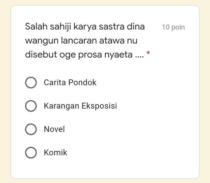 Salian ti unsur intrinsik, dina karya sastra wangun prosa oge aya unsur ekstrinsik. wangun karya sastra nilik kana wangunna, karya sastra téh bisa dibagi jadi tilu golongan nyaéta puisi, prosa, jeung drama. novel nyaeta karya sastra dina wangun lancaran atawa prosa. Kaasup kana karya sastra modern. Berupa karya sastra wangun lancaran (prosa) palaku dongeng bisa naon wae, umpamana jelema. Mangrupa karya sastra dina wangun lancaran atanapi prosa artinya. Dongéng atawa dangiang mangrupa salah sahiji golongan carita dina wangun prosa (lancaran). Asal kecapna tina waca nu hartina maca atawa dibaca. Ku kituna, bisa dicindekkeun yén wawacan téh karangan naratif anu didangding jeung dianggit ku pupuh. Unsur unsur intrinsik nyaeta unsur unsur nu biasana aya dina karya sastra saperti prosa. Preview (30 questions) show answers. Dina sisindiran, eusi atawa maksud anu dikedalkeun téh dibungkus ku cangkangna. Aya dua rupa prosa nyaeta prosa modern jeung prosa buhun.