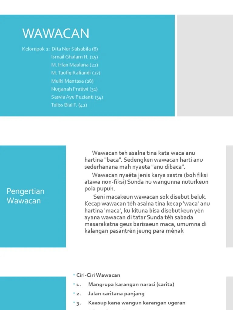 Mangrupa karya sastra sampeuran d. Rini anggraini 180210120033 aya ahmad bakri sajeroeun ua haji dulhamid jeung ronggeng sajajagat sastra téh gambaran kahirupan, jeung éta gambaran kahirupan téh kanyataan sosial. Téma tema nyaéta ide, maksud atawa tujuan anu hayang. Warna prosa aya nu heubeul, jeung aya nu anyar. Wawacan nyaeta salah sahiji karya sastra wangun prosa heubeul panjang nu dianggit make patokan pupuh. karya sastra anu winangun prosa rekaan (fiksi) dina wangun lancaran disebut. Carita wayang kaasup jenis prosa buhun. karya sastra ialah ciptaan yang disampaikan secara komunikatif tentang maksud penulis untuk tujuan estetika.karya sastra merupakan bentuk karya yang sangat indah baik secara lisan atau tulisan. ciri ciri carita pondok (carpon) jumlah kecapna tara lewih ti 10.000 kecap (jumlah kata tidak lebih dari 10.000 kata) waktu macana antara 10 nepi ka 20 menit( waktu bacanya antara 10 sampai 20 menit), 1 puisi wangun ugeran puisi biasa. Cacarakan), dan juga huruf arab. Seleksi cerita dalam karya sastra novel lebih luas. Mangrupa karya sastra dina wangun lancaran atanapi prosa artinya.